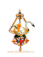 Среди разнообразных материалов, применяемых ювелирами, одним из излюбленных был "барочный" жемчуг — жемчуг неправильной, причудливой формы. Здесь природная неровность поверхности, чередованием света и тени усиливает обычную перламутровую игру жемчуга, создает впечатление живой переменчивости. Исходя из формы жемчужины, мастер придумывает ту или иную фигуру, дополняя ее золотом, эмалью и украшает драгоценными камнями. К таким изделиям относится, среди прочих, подвеска в виде лебедя, основу которой составляет такой барочный жемчуг.
